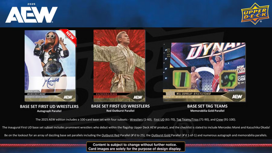 The 2025 AEW edition includes a 100-card base set with four subsets - Wrestlers (1-60), First UD (61-70), Tag Teams/Trios (71-90), and Crew (91-100).